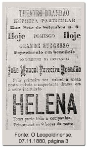 Segundo esta divulgação, na página 3 da edição de 1 de novembro de 1880, João Manoel Ferreira Brandão levaria à cena, pela primeira vez em Leopoldina, a peça Helena. O endereço do Theatro Brandão: rua Sete de Setembro.