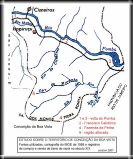 AS TERRAS QUE ESTÃO HA CINCO GERAÇÕES COM A MINHA FAMÍLIA, FICAM NA INDICAÇÃO DE NÚMERO 4 DO SEU MAPA. INCLUSIVE LOCALIZEI NA PROPRIEDADE UMA ANTIGA TRINCHEIRA DE DIVISA DOS ESTADOS DE MG E RJ (ONDE VÇ INDICA COMO SENDO A FAZENDA DA PEDRA DO BARÃO DE AVELAR RESENDE). A ANTIGA DIVISA PASSARIA DE FATO BEM ANTES DO CÓRREGO DO EVA E NÃO COMO NOS DIAS DE HOJE SOBRE A SUA FOZ. HOJE O ESTADO DO RIO ACRESCEU ESSA PORÇÃO DE TERRAS MINEIRAS, E INCLUSIVE A DIVISA PASSA ABAIXO DO CÓRREGO EVA, SOBRE O TRASSADO RIBEIRÃO BOM JARDIM. NÃO TEM MAIS A INDICAÇÃO DO SEU MAPA QUE DATA DO FINAL DO SÉCULO XIX.