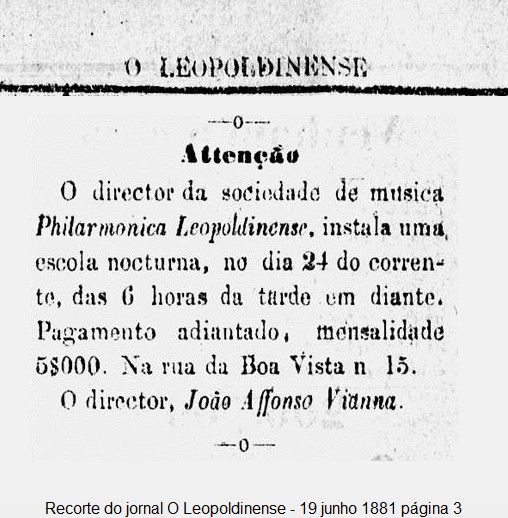 Há 132 anos esta sociedade musical instalava uma escola noturna na rua da Boa Vista, número 15, conforme anúncio mandado publicar n’O Leopoldinense pelo seu diretor, João Afonso Viana.