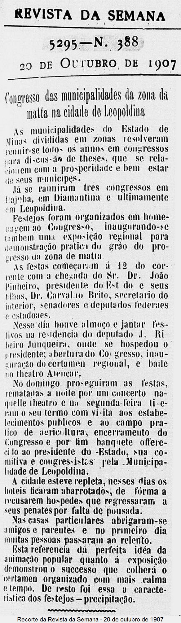 Amanhã completam-se 106 anos da realização do Congresso das Municipalidades da Zona da Mata na cidade de Leopoldina. Entretanto, a se basear na notícia abaixo, publicada na Revista da Semana do dia 20 de outubro daquele ano, não teria passado de um encontro de partido político.