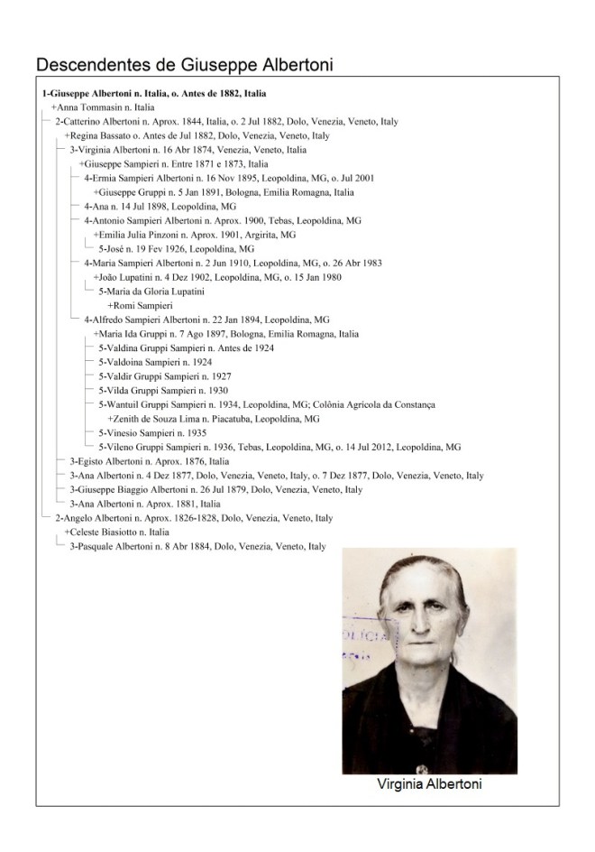 As mais antigas referências obtidas com familiares davam conta de que Virginia Albertoni tinha vindo para o Brasil sem os pais, acompanhando uma família com a qual trabalhava como babá. Entretanto, descobrimos que os pais dela haviam falecido no início da década de 1880. O irmão dele assumiu o cuidado dos sobrinhos e, quando decidiu deixar a Itália, trouxe-os para o Brasil.