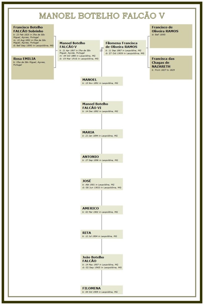 No mês em que se comemora o sesquicentenário de nascimento de Manoel Botelho Falcão V, seu terceiro neto Caio Botelho Falcão localizou mais uma informação para ampliar o conhecimento da família. Trata-se do registro de nascimento de Francisco Botelho Falcão Sobrinho, o açoriano que chegou a Leopoldina na segunda metade no século XIX, deixando enorme descendência no município. Francisco, o pai de Manoel V, nasceu em 1825.