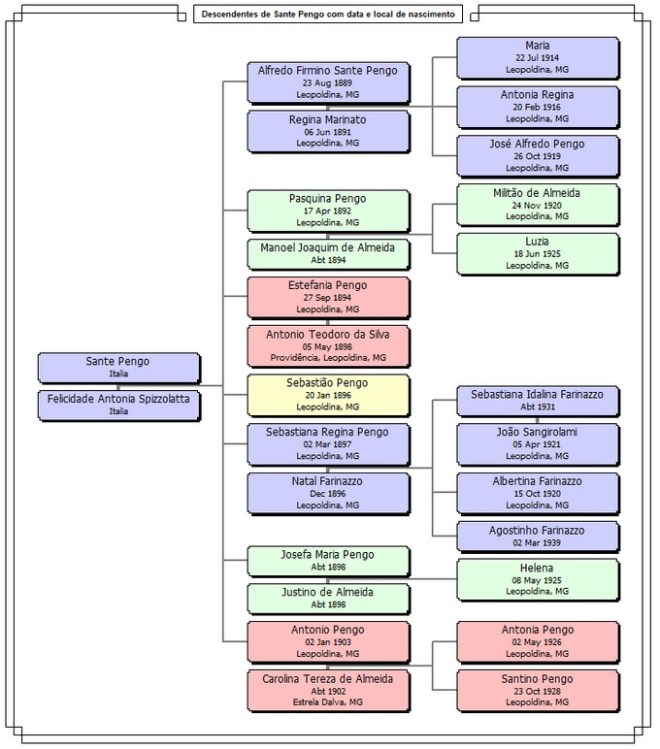 A pedido de visitante do site, apresentamos um quadro de descendentes dos italianos Sante Pengo e Felicità Antonia Spizzolatta, com as datas e locais de nascimento que encontramos.