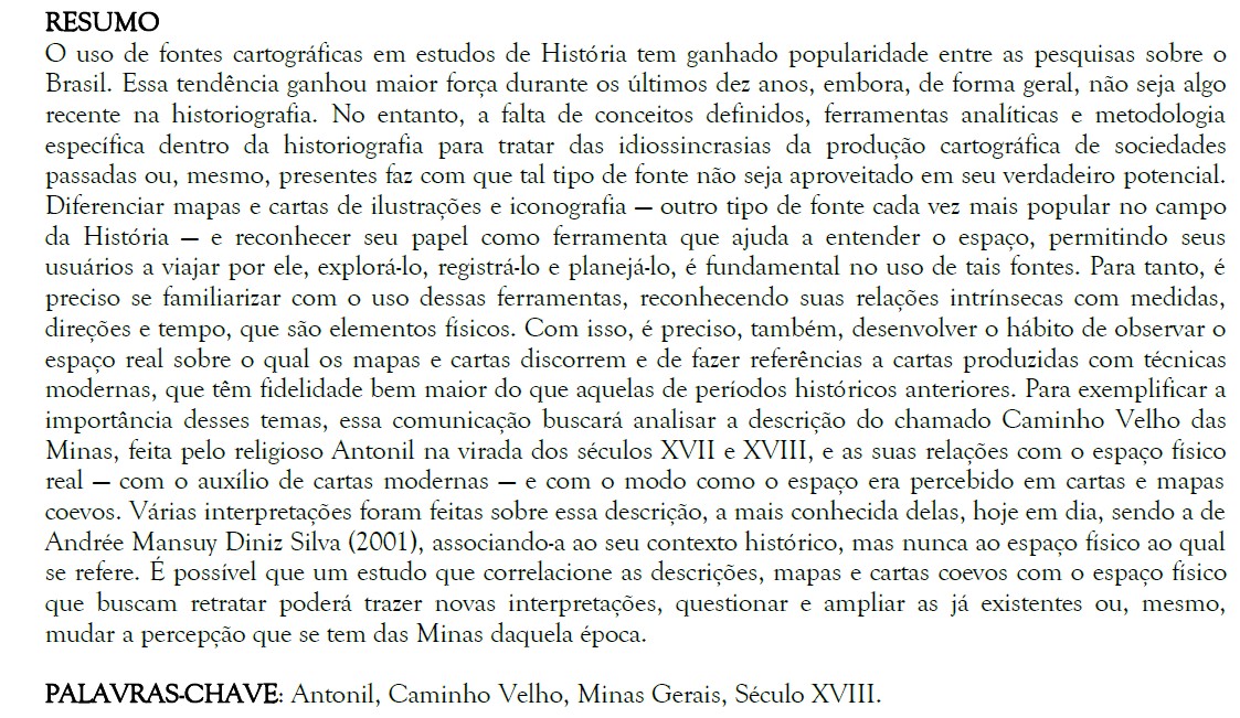 “Nesta comunicação arrolamos alguns dos resultados de nossos estudos concernentes a certos núcleos populacionais existentes em Minas Gerais no período colonial brasileiro. Não se trata, pois, de um sumário exaustivo de nossos trabalhos; selecionamos, tão somente, uma série de observações que, embora superficialmente, ilustram o esforço que temos votado ao entendimento dos processos demográficos e econômicos verificados na área de Minas Gerais na qual predominou a exploração do ouro e das pedras preciosas. Deve-se frisar, ademais, que nossas pesquisas, conquanto se refiram a parcela significativa dos centros mineratórios e a amplo lapso temporal, não abarcam a totalidade da população mineira nem abrangem todo o período colonial.”