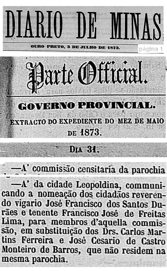 Em Leopoldina, a organização dos serviços esteve a cargo do Vigário José Francisco dos Santos Durães e de Francisco José de Freitas Lima que, conforme se verifica na nota abaixo, substituíram os primeiros nomeados por não residirem na Paróquia.