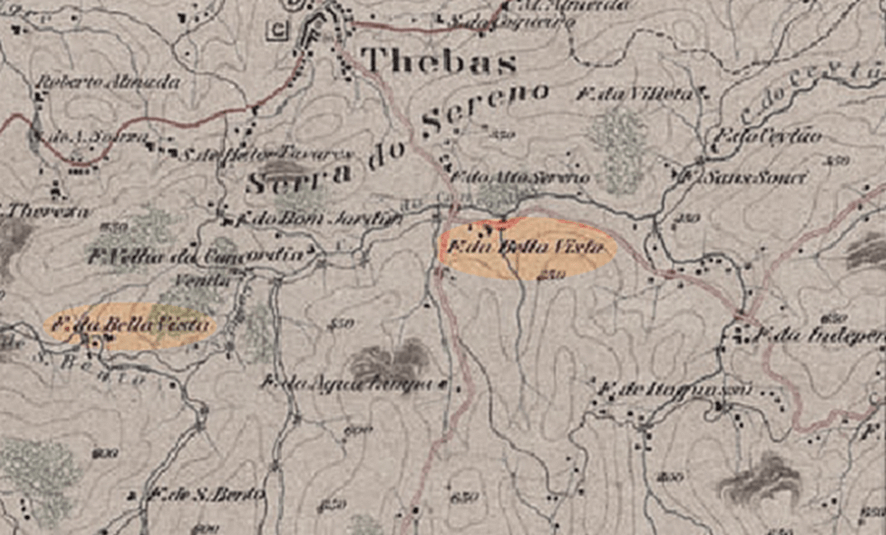 Outro instrumento importante foi a cartografia produzida em 1926, por trazer nomes de antigas propriedades que ainda existiam. Descobrimos, então, que na área provável onde foi formada a fazenda Monte Alegre[2], que deu origem ao arraial de Tebas, em 1926 existiam duas propriedades com o nome de Bela Vista cuja distância em linha reta de uma sede a outra era de aproximadamente 4 km. Oras, se a fazenda Monte Alegre media 18 km2, parece provável que as duas Bela Vista fossem sítios da mesma fazenda.