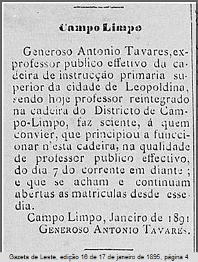 Previous ImageNext Image Professor Público em Campo Limpo, Leopoldina, MG Notícia publicada na Gazeta de Leste, edição 16, de 17 de janeiro de 1891