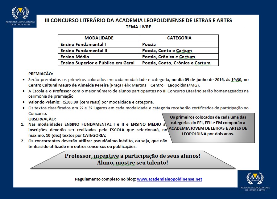 Previous ImageNext Image III Concurso Literário da ALLA Informações sobre o Concurso 2016, cujas inscrições estarão abertas de 1 a 15 de maio.