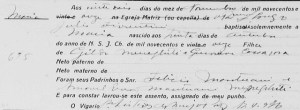 Conforme se observa, os dois assentos acima trazem quase os mesmos dados. A exceção fica por conta do ano de batismo e nascimento, que no primeiro assento era 1880 e agora é 1885. Ressalte-se, porém, que a palavra “cinco” está envolvida por um pontilhado, parecendo demonstrar que o próprio copiador ficou em dúvida.