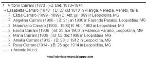 6. Vittorio Carraro, filho de Francesco Carraro e Santa Bordin casou com Elisabetta Carraro a 30 Jul 1898 em Leopoldina, MG.