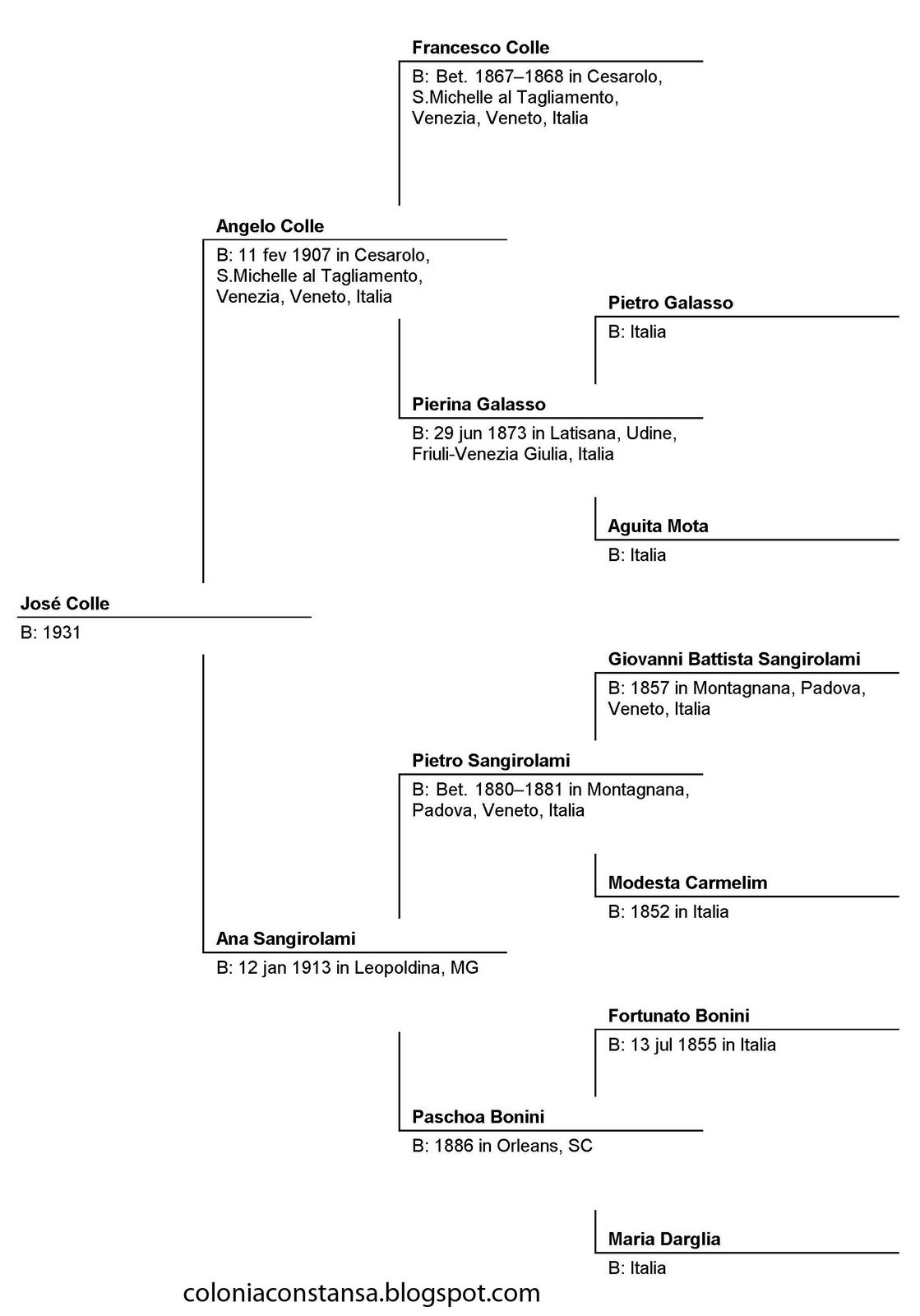 6. Giovanni Sangirolami, filho de Giovanni Battista Sangirolami e Modesta Carmelim, nasceu a 27 Jun 1883 em Stanghella, Montagnana, Padova, Veneto, Italia. Giovanni também usou o nome João Luiz Zangirolani. Casou com Giustina Borella a 26 Mai 1906 em Providência, Leopoldina, MG.
