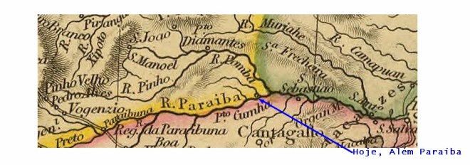 Evidentemente que a seleção dos pontos marcados numa cartografia é escolha do autor que recorre ao conhecimento produzido até então e depende do espaço disponível. Parece-nos, portanto, que além do Porto do Cunha, conhecido desde o final do século anterior por conta da expedição comandada por Galvão de São Martinho, no percurso final do Rio Pomba não havia outro povoado de destaque. E se observarmos atentamente a linha pontilhada no recorte acima, que marca a divisa entre as províncias, veremos que Santo Antônio de Pádua ficou dentro dos limites de Minas. Sabemos, porém, que o povoado surgiu no ponto em que o Rio Paraíba do Sul recebe o Rio Pomba e que ficava na província fluminense conforme já mencionado no artigo a seguir.