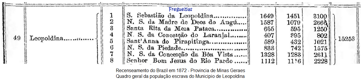 Nos quadros acima estão incluídos todos os distritos que então pertenciam a Leopoldina, quais sejam: Madre de Deus do Angu (hoje pertencente a Além Paraíba); Meia Pataca (hoje o município de Cataguases); Laranjal (hoje município); Pirapetinga (hoje município); Conceição da Boa Vista (atualmente distrito de Recreio); e, Bom Jesus do Rio Pardo (atual município de Argirita).