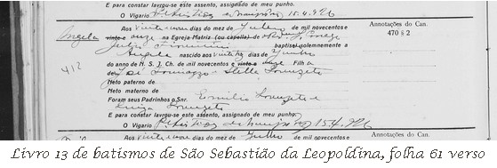 Assentos Paroquiais de Leopoldina: Livro 2 cas fls 100 reg. 113, fls 102-v nr 128, fls 111v reg. 187; Livro 3 cas fls 28 nr 56; Livro 5 cas fls 399 termo 6.