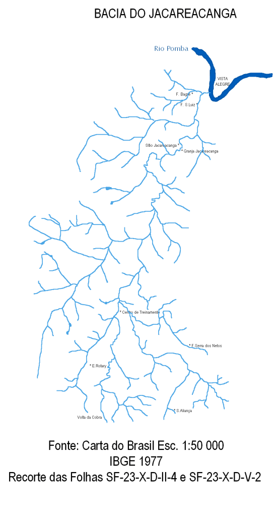 O que se quer contar é um pouco da história do Ribeirão Jacareacanga, irmão do Feijão Cru, porque nascem na mesma serra da subida da Volta da Cobra. Um à direita e o outro à esquerda da estrada que segue para o Arraial dos Montes / São Lourenço e Abaíba. O Jacareacanga, na região da Serra dos Netos, nasce no alto do morro e por entre pedras e árvores desce a encosta por um dos vales e vai recolhendo as águas de pequenas nascentes. Quando chega à parte plana, em terras que formavam a antiga fazenda Fortaleza, antes de cruzar a BR-116 recebe pela margem direita o Córrego Fortaleza. Logo depois, na outra margem da rodovia, pelo lado esquerdo recebe a contribuição do Córrego Três Cruzes, que lhe traz as águas das encostas da região do Brasília Country Club. Segue seu curso e, na Fazenda Estrela, recebe o córrego Bela Vista e o Pau Cascado, afluentes da margem esquerda.