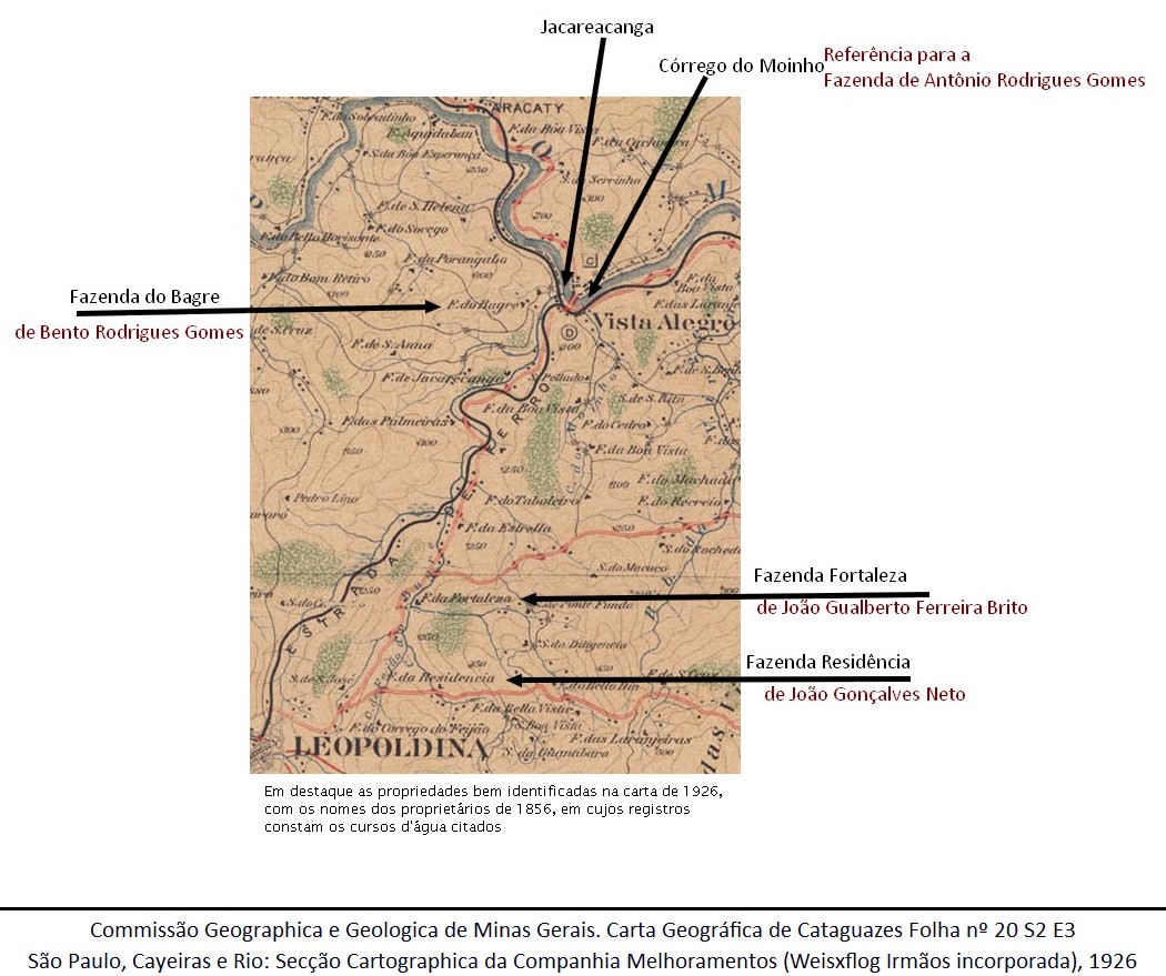 No jornal O Leopoldinense, edição 65, 08.09.1885, p. 3, nota intitulada “Serviço de Immigração” informa que “até 2ª ou 3ª o fiscal adquirirá, por conta do Estado, o Sítio Jacareacanga, onde vai ser montada uma hospedaria com capacidade para receber 1200 imigrantes.” Na folha 20 S2 E3 da cartografia da Comissão Geographica e Geologica de Minas Gerais de 1926, consta que no terço final do Ribeirão localizava-se a Fazenda Jacareacanga.