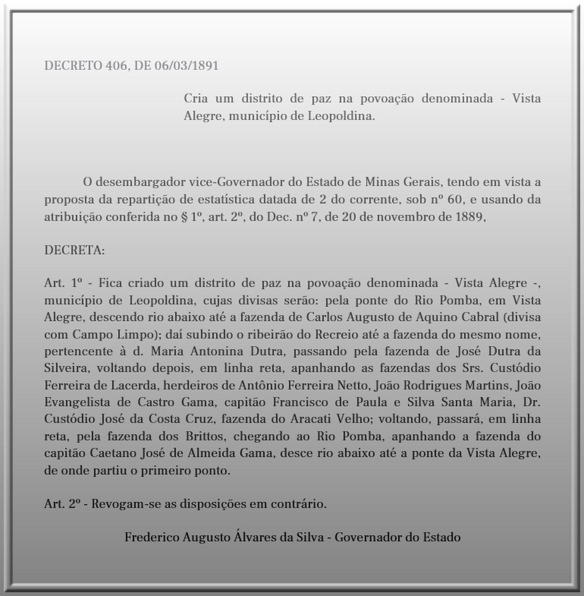 E no dia 6 de março de 1891, conforme o Decreto 406 acima, foi criado um Distrito de Paz com o nome de Vista Alegre, na margem direita do Pomba, município de Leopoldina, exatamente no entorno da mencionada Estação.
