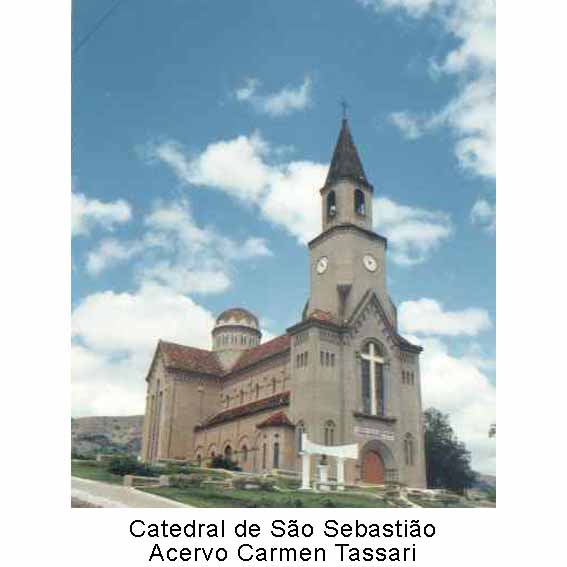 "A Matriz é consagrada a S. Sebastião. É esse um templo magestoso e solemne que eleva-se, ostentando ao céu a sua symbolica cruz, sobre bella e romântica eminência que domina toda a cidade, tendo na frente gracioso e lindo jardim com largas alamedas que cruzam-se entre si, um caprichoso repuxo d'agua, e no centro uma grande Cruz, symbolo de paz e de amor. O interior desta Matriz é ricamente decorado tendo do estatuas de alto valor. No altar-mór erguem-se as estatuas do Coração de Jesus e de N. S. das Dores. Os altares lateraes são consagrados a S. Geraldo e S. Rita de Cássia e de frente ao Baptistério vê-se Nosso Senhor dos Passos. A Gruta de Lourdes é maravilhosamente bella; visitando-a a alma se esquece dos prazeres fugazes deste mundo e se eleva ao Céu, toda absorvida em Deus. Esta Egreja, Casa de Deus, fica sempre aberta, noite e dia, e nella se pratica a adoração perpetua; todo o anno ha bênçãos com cânticos e grande solemnidade, e, 3 vezes por dia, rosario com todos os mystérios. Esse templo, o mais bello desta região da Matta, é ricamente iluminado por 103 lâmpadas eléctricas de 100 e 50 velas."