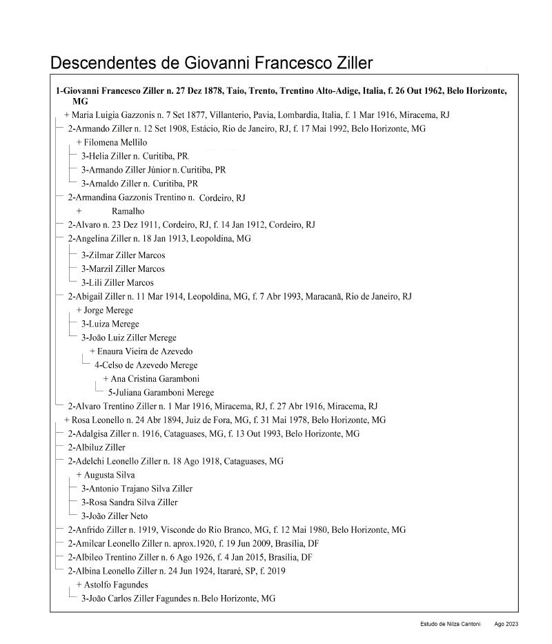 Reunindo outras informações, observamos que a provável mãe do Giovanni Battista Ziller que viveu em Leopoldina tinha o sobrenome Zamboni, que é o mesmo do padrinho de Angelina Ziller, batizada em Leopoldina: Rochi Zamboni. Este personagem pode ser da família de Pietro Zamboni que passou ao Brasil em 1896, radicando-se em Mar de Espanha.